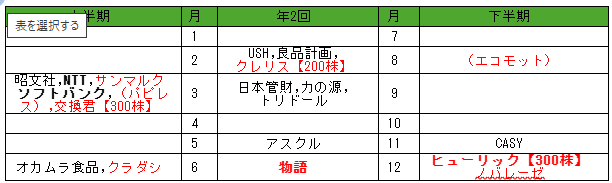 株主優待は年1回もらえる株と年2回もらえる株があり、いつ何がもらえるのか、権利確定日毎に保有している株、今後保有予定の株を表にまとめました。 優待を貰うためには、複数単元株持つ必要があったり、長期保有が条件がある株はわかるように記載しました。