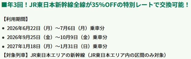 2026年3月14日から交換ポイントが変わりました。それに伴い年3回35%OFFの特別レートで交換可能な期間が設定されました。東京-新青森駅の場合、
