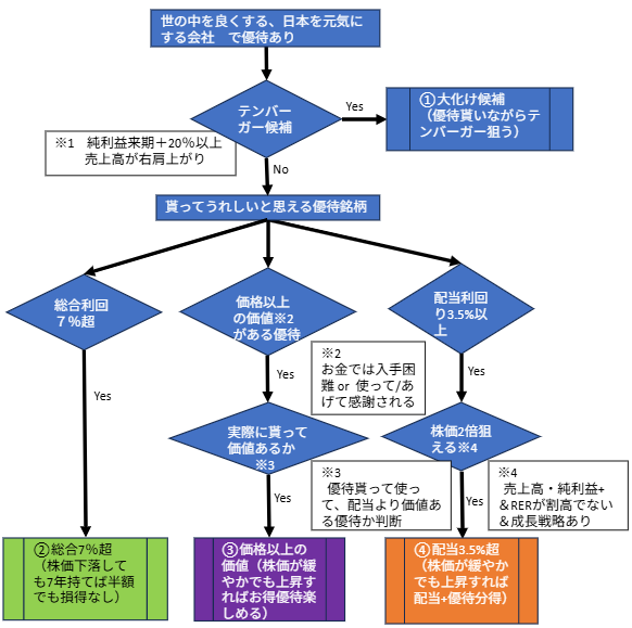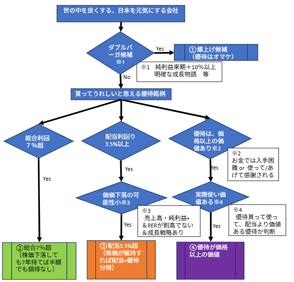 以上の考えを基にした優待銘柄を選定するフローは以下のようになります。