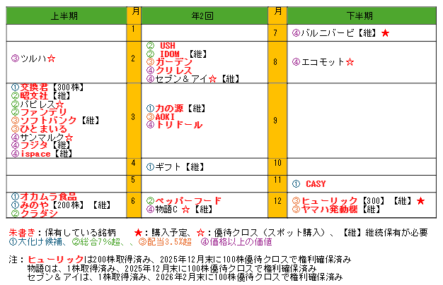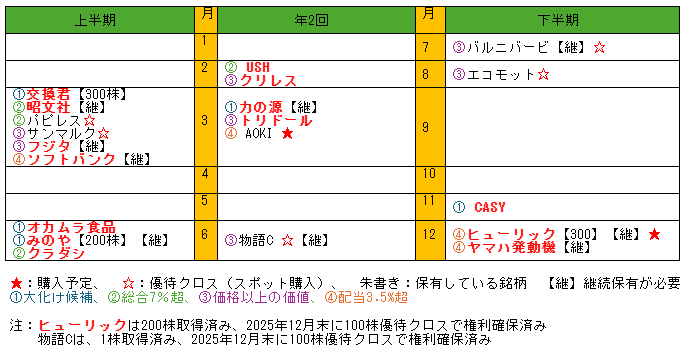 株主優待は年1回もらえる株と年2回もらえる株があり、何月に何がもらえるのか表にまとめました。 計画的に取得できるように、購入予定の株は★印、優待クロスやスポット購入予定の株は☆印、保有している銘柄は朱書き、100単元より多く保有する必要がある銘柄は【】で必要株数を明確にしました。
