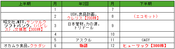 株主優待は年1回もらえる株と年2回もらえる株があり、いつ何がもらえるのか、権利確定日毎に保有している株、今後保有予定の株を表にまとめました。 優待を貰うためには、複数単元株持つ必要があったり、長期保有が条件がある株はわかるように記載しました。